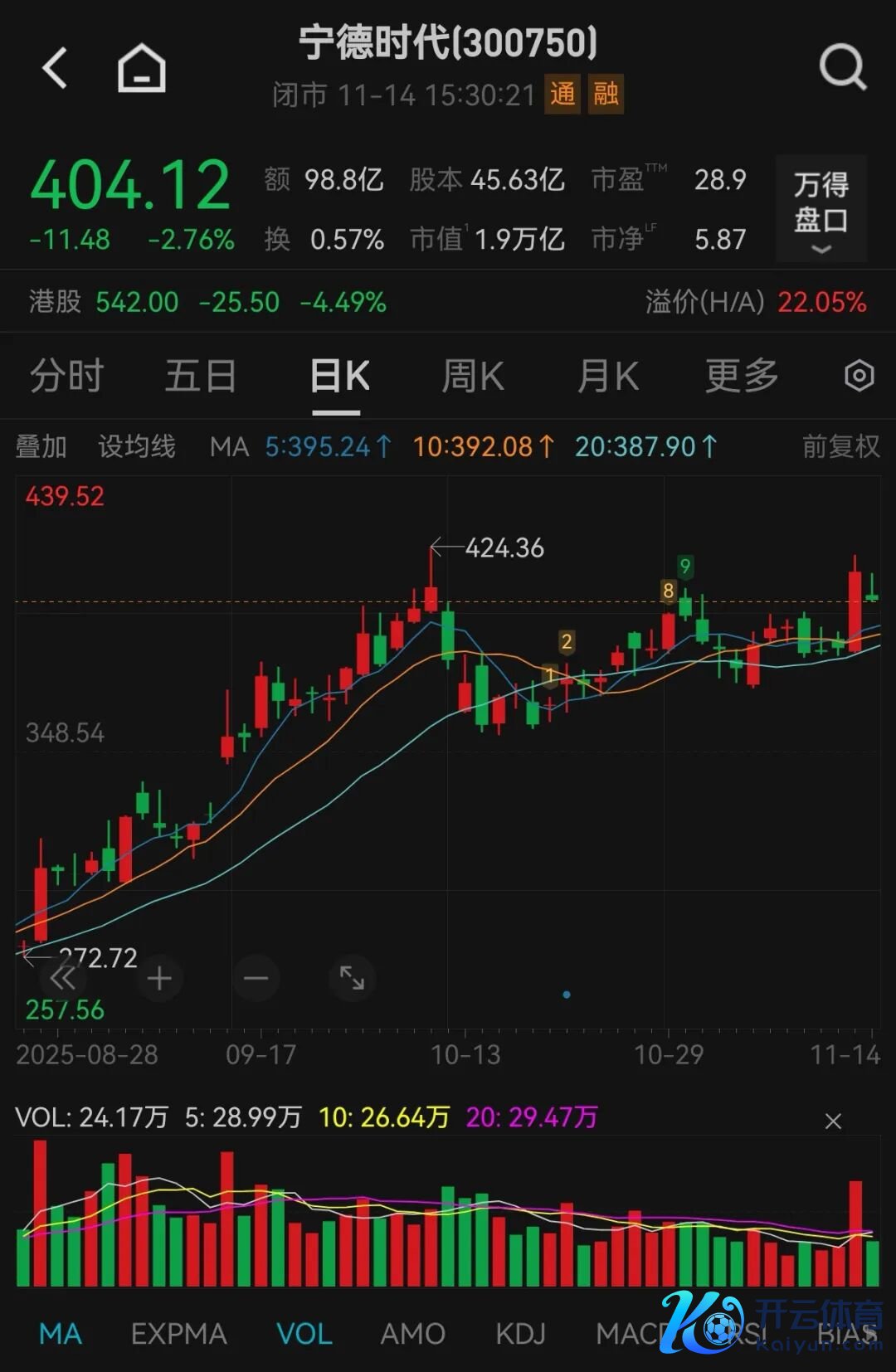 以宁德期间戒指11月14日的收盘价(404.12元/股)估算,上述股份市值约184.41亿元。