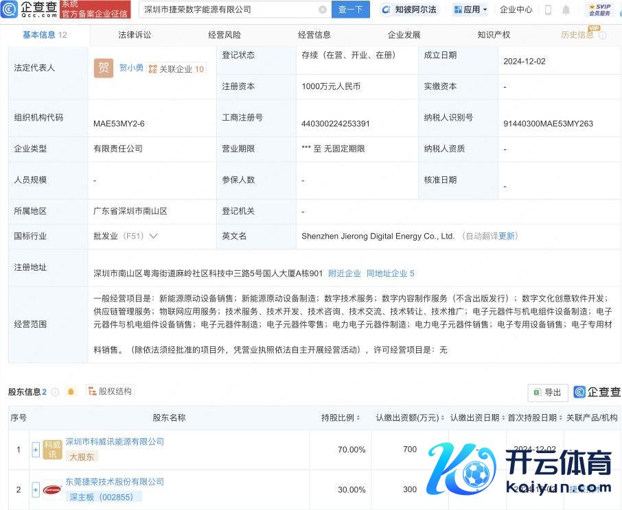 企查查APP浮现开云kaiyun体育,近日,深圳市捷荣数字动力有限公司设立,法定代表东谈主为贺小勇,注册本钱1000万东谈主民币,打算鸿沟包含:新动力原动开荒制造、数字技能处事、供应链贬责处事、物联网欺骗处事等。企查查股权穿透浮现,该公司由捷荣技能(002855)等共同捏股。