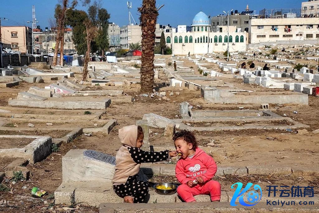 当地时刻2025年1月12日,在加沙地带代尔拜拉赫地区的一处坟场,两名儿童正在吃食品,周围是因陡立而被动到此逃一火的家庭。