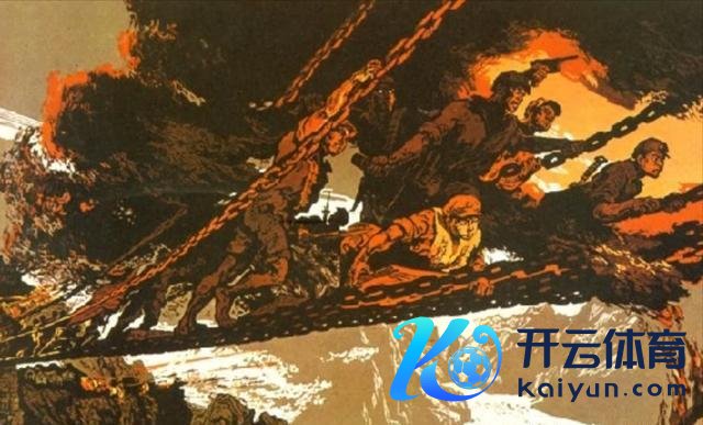 在行将抵达桥头的要道时刻,敌方却出乎预感地举动,他们倾倒煤油于铁索之上,当场铁索之上燃起凶猛的火焰。