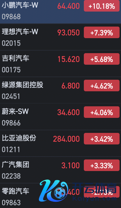 2月4日音书,港股汽车股全线走强,造车新势力地点领涨,适度发稿开云kaiyun,小鹏汽车涨超10%,理念念汽车涨超7%,蔚来涨超4%。