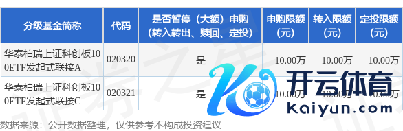 本站讯息,2月22日华泰柏瑞基金处置有限公司发布《华泰柏瑞上证科创板100交游型洞开式指数证券投资基金发起式齐集基金截止大额申购(含支援转入、按时定额投资)业务的公告》。公告中辅导,为保证本基金的沉稳运作,保护基金份额抓有东谈主利益,以及证实《华泰柏瑞上证科创板100交游型洞开式指数证券投资基金发起式齐集基金基金契约》的干系递次,自2025年2月24日起华泰柏瑞上证科创板100交游型洞开式指数证券投资基金发起式齐集基金截止大额申购(含支援转入、按时定额投资)业务,申购、支援转入上限金额为10.0万元,下属分级基金调节明细如下: