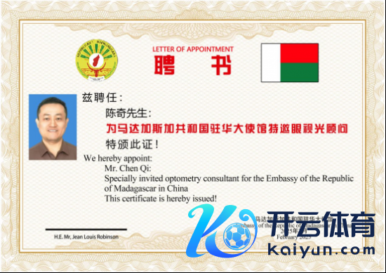 2025年2月15日,马达加斯加共和国驻华大使让·路易·罗班松(Robinson Jean-Louis),马达加斯加驻华大使代表马达加斯加共和国聘用陈奇先生为:马达加斯加共和国驻华大使馆特邀眼视光参谋人。