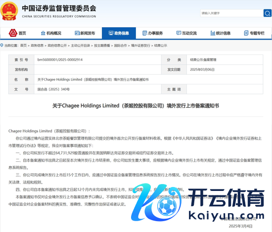 中国证监会外洋互助司本日发布对于Chagee Holdings Limited(茶姬控股有限公司)境外刊行上市备案告知书。